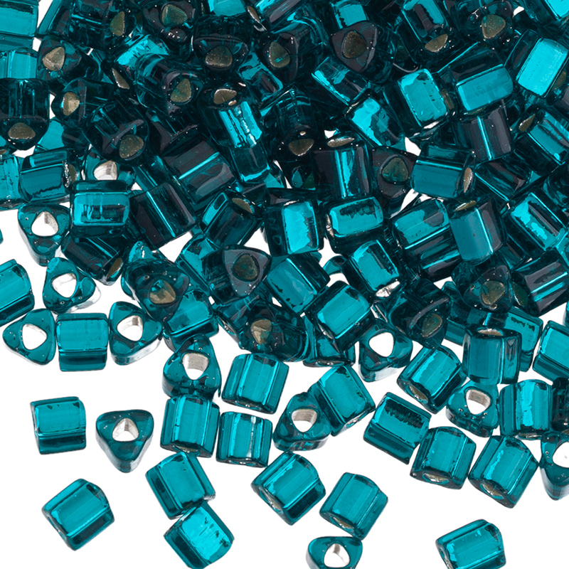 Японский бисер TOHO — треугольный (TOHO triangles), размер 8/0 (высота 3 мм). Отверстие 1 мм. Цвет #27BD (Silver-Lined Teal, внутреннее серебрение, сине-зеленый). Цена указана за 10 грамм (примерно 250 шт).