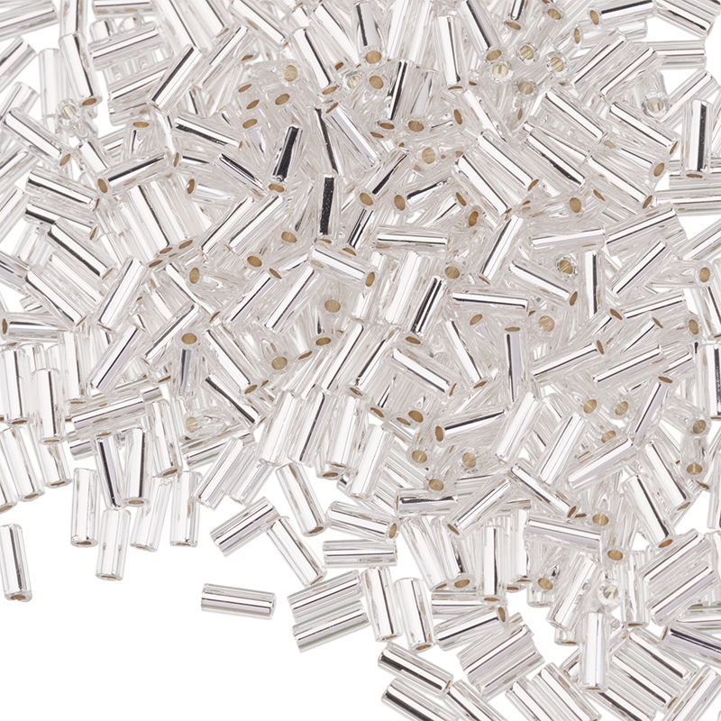 Японский бисер TOHO Bugle — стеклярус прямой (длина 4,5 мм, диаметр примерно 1,8 мм, отверстие 0,7 мм). Цвет: Silver Crystal #21 (внутреннее серебрение, хрусталь). Цена указана за 10 грамм (примерно 200-250 шт., количество бисерин может варьироваться в зависимости от цвета бисера).