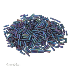 Японский бисер MIYUKI Bugle — стеклярус классической формы (стекло). Цвет: #401F (полупрозрачный черный), эффект: Matte AB (матовый радужный). Обратите внимание: из-за особенностей покрытия итоговый цвет - радужный с основным переходом от фиолетового к голубому. Длина: 6 мм, диаметр: 1,7 мм, отверстие: 0,7 мм. Цена указана за 10 грамм (примерно 400 шт).