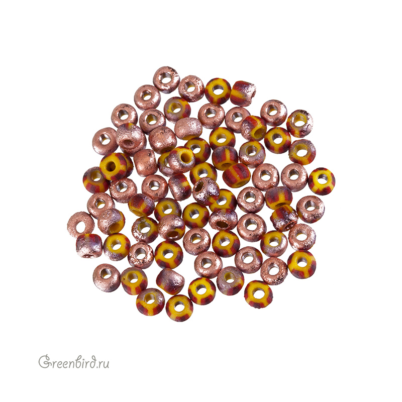 Чешский круглый бисер PRECIOSA Czech 5/0 (стекло). Цвет: #83910M-27181 (YELLOW/BROWN/RED, Etched CAPRI, матовый, непрозрачный, желтый с красными и коричневыми полосками, травление: бронза). Размер: 4,6 мм, отверстие: 1,1 мм. Производство: Чехия. Цена указана за 10 грамм.
