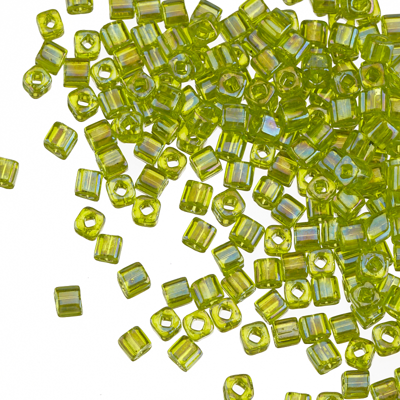 Японский кубический бисер TOHO Cube, размер: 3 мм, отверстие: 1,6 мм. Цвет: прозрачный, радужный, зеленый лайм (#164). Цена указана за 10 грамм.