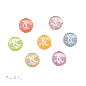 Бусины с буквами пластиковые. Цвет: в ассортименте; печать рисунка: белый. Размер: 6,7 х 7 мм, толщина: 4,1 мм, отверстие: 1,6 мм. Обратите внимание: это микс из разноцветных бусин. Вы получите бусину случайного цвета. Производство: Китай. Цена указана за 1 шт.