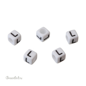 Пластиковые бусины-буквы (латиница) в виде кубика. Цвет: белый; печать рисунка: черный. Размер: 5,8 х 5,8 мм, отверстие: 3,6 мм. Производство: Китай. Цена указана за 1 шт.