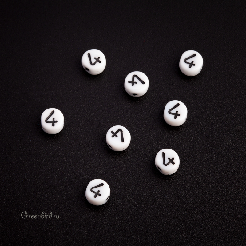 Бусины с цифрами White Letter Beads (стекло). Цвет: белый, печать рисунка: черный. Размер: 6,1 х 6,5 мм, толщина: 4,1 мм, отверстие: 0,8-1 мм. Производство: Чехия. Цена указана за 1 шт.