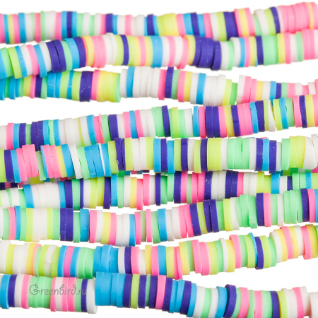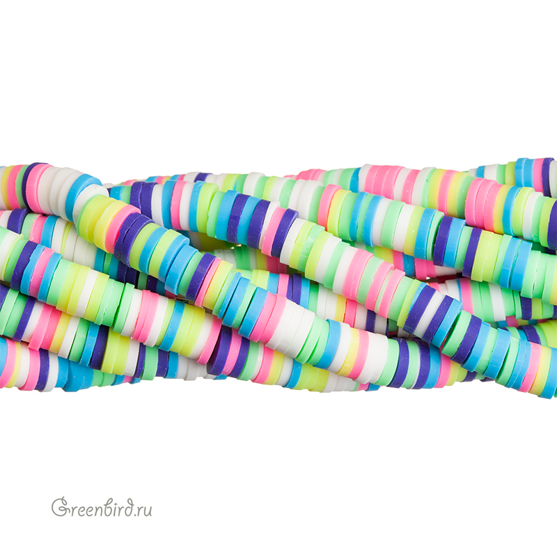 Легкие и гибкие цветные бусины в форме дисков. Материал: резина (каучук). Цвет: фестиваль, микс зеленого, розового, белого, желтого, фиолетового и голубого. Диаметр: 5,6-6,05 мм, толщина: 0,8-1,1 мм, отверстие примерно 1,8 мм. Размеры могут незначительно отличаться. Производство: Китай. Цена указана за нить 40 см (примерно 350 штук).