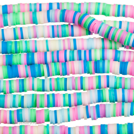 Легкие и гибкие цветные бусины в форме дисков. Материал: резина (каучук). Цвет: конфетти, микс зеленого, розового, белого, бледно-желтого, синего и голубого. Диаметр: 5,6-6,05 мм, толщина: 0,8-1,1 мм, отверстие примерно 1,8 мм. Размеры могут незначительно отличаться. Производство: Китай. Цена указана за нить 40 см (примерно 350 штук).