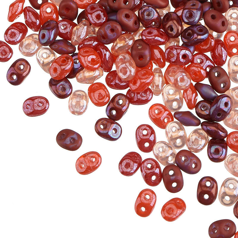 Бусины SuperDuo (стекло). Цвет: микс красных оттенков. Размер: 2,5 x 5 мм, отверстие: 0,8 мм. Производство: Чехия. Цена указана за 10 грамм (примерно 120 штук).