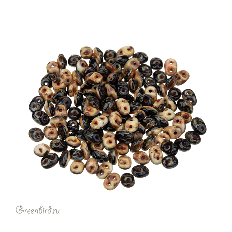 Бусины SuperDuo Duets (стекло). Цвет: #63132/86805 (черный/белый, темный травентин). Размер: 2,5 x 5 мм, отверстие: 0,8 мм. Производство: Чехия. Цена указана за 10 грамм (примерно 120 штук).