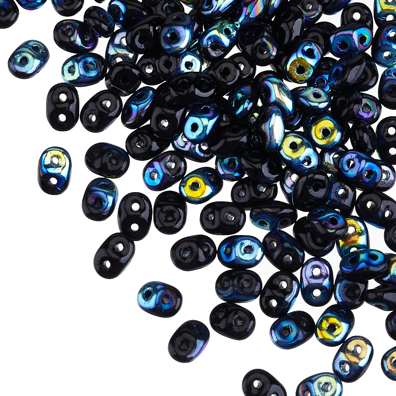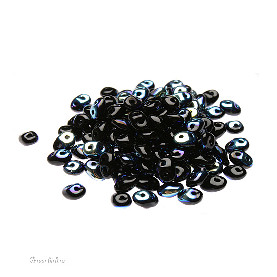Бусины SuperDuo (стекло). Цвет: #X23980 (черный AB). Размер: 2,5 x 5 мм, отверстие: 0,8 мм. Производство: Чехия. Цена указана за 10 грамм (примерно 120 штук).