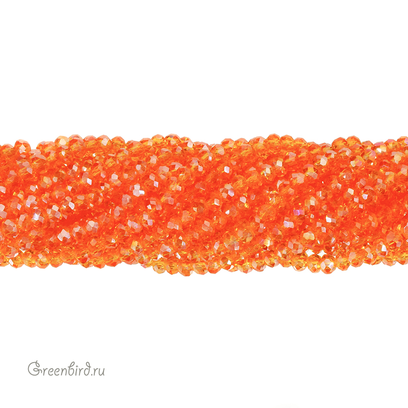Бусины граненые Rondelle. Материал: стекло. Цвет: мандариново-оранжевый (прозрачный); покрытие: Aurore Boreale, радужный эффект (полупрозрачное переливающееся напыление, нанесено на поверхности граней бусины в разных пропорциях). В зависимости от партии интенсивность радужного эффекта и его оттенок могут отличаться. Размер: от 2,9 х 1,95 мм до 3,1 х 2,25 мм, отверстие: 0,5-0,6 мм. Цена указана за нить (примерно 180 штук).