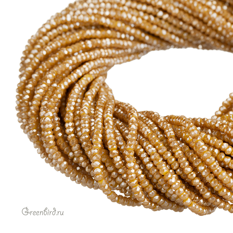 Бусины граненые Rondelle. Материал: стекло. Цвет: лимонный (непрозрачный), покрытие: горчичный (частичное, непрозрачное, нанесено на бусину в различном объеме) / золотистый перламутр (полное, полупрозрачное, нанесено верхним слоем). Размер: от 2,4 х 1,5 мм до 2,6 х 1,8 мм, отверстие: 0,5-0,6 мм. Цена указана за нить (примерно 130 штук).
