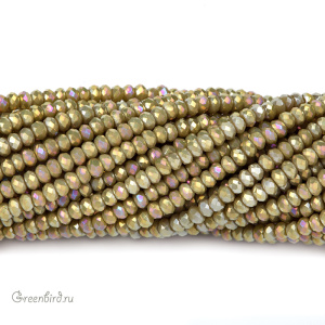 Бусины граненые Rondelle. Материал: стекло. Цвет: горчично-зеленый (непрозрачный), покрытие: золотистый металлик / Aurore Boreale, очень легкий радужный эффект (смешанное, частичное, нанесено на бусину в различных пропорциях). Из-за особенностей покрытия бусины могут незначительно отличаться по цвету. Размер: от 2,4 х 1,6 мм до 2,6 х 1,8 мм, отверстие: 0,5-0,6 мм. Цена указана за нить (примерно 130 штук).
