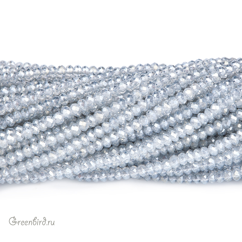 Бусины граненые Rondelle. Материал: стекло. Цвет: жемчужно-серый (прозрачный), покрытие: серебристый перламутр (полное). Размер: от 2,3 х 1,6 мм до 2,6 х 1,8 мм, отверстие: 0,5-0,6 мм. Цена указана за нить (примерно 150 штук).