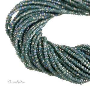 Бусины граненые Rondelle. Материал: стекло. Цвет: зеленый жадеит (полупрозрачный, дымчатый, на просвет золотисто-зеленый), покрытие: золотистый радужный перламутр (полное, полупрозрачное). Размер: от 2,3 х 1,7 мм до 2,5 х 2,0 мм, отверстие: 0,5-0,6 мм. Цена указана за нить (примерно 140 штук).