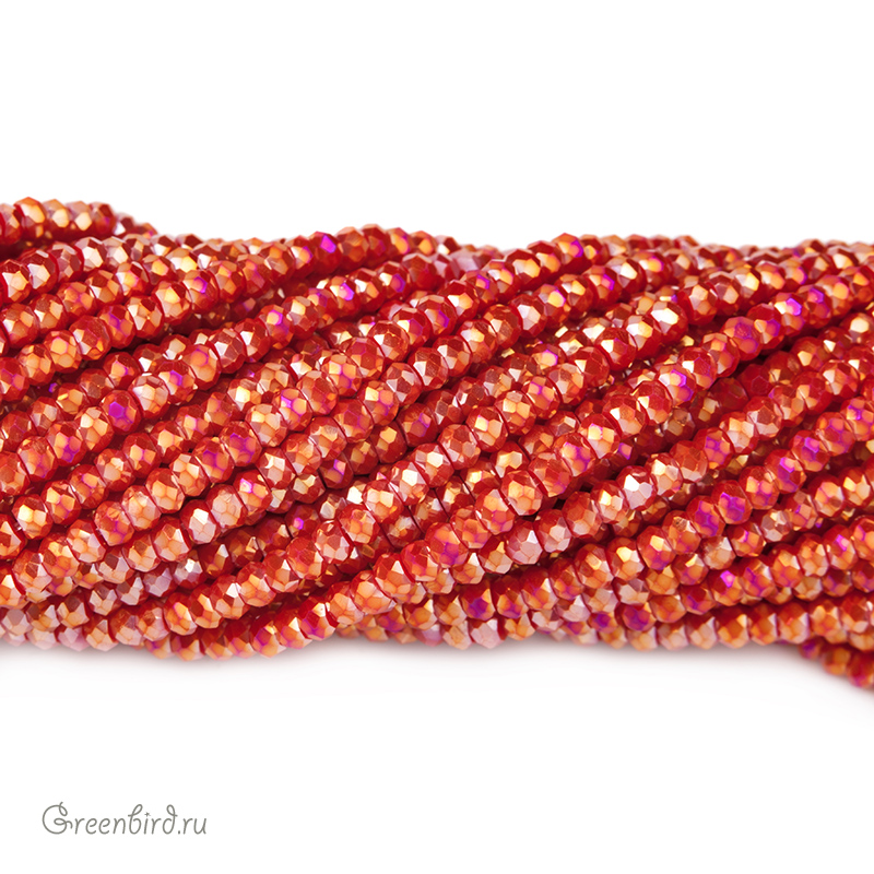 Бусины граненые Rondelle. Материал: стекло. Цвет: алый (непрозрачный), покрытие: золотой перламутр / серебристый перламутр / малиновый с эффектом Aurore Boreale (смешанное, полное, нанесено на бусину в различных пропорциях). Из-за особенностей покрытия бусины могут незначительно отличаться по цвету. Размер: от 2,4 х 1,5 мм до 2,6 х 1,7 мм, отверстие: 0,5-0,6 мм. Цена указана за нить (примерно 140 штук).