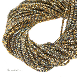 Бусины граненые Rondelle. Материал: стекло. Покрытие: золотой / джинсовый синий металлик (смешанное, полное, нанесено на бусину слоями в различных пропорциях с преобладанием золотого оттенка). Из-за особенностей покрытия бусины в каждой упаковке могут незначительно отличаться по цвету. Размер: от 2,3 х 1,5 мм до 2,7 х 1,8 мм, отверстие: 0,5-0,6 мм. Цена указана за нить (примерно 140 штук).