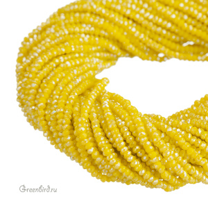 Бусины граненые Rondelle. Материал: стекло. Цвет: лимонно-желтый (непрозрачный), покрытие: золотистый перламутр с легким радужным эффектом (полное, полупрозрачное или практически прозрачное). Размер: от 2,4 х 1,4 мм до 2,7 х 2,0 мм, отверстие: 0,5-0,6 мм. Цена указана за нить (примерно 130 штук).
