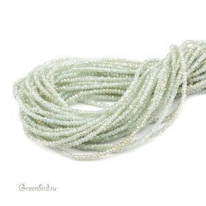 Бусины граненые Rondelle. Материал: стекло. Цвет: светлый нефрит (непрозрачный), покрытие: бледно-золотистый перламутр (частичное, нанесено примерно на половину бусины). Размер: от 2,5 х 1,5 мм до 2,6 х 1,7 мм, отверстие: 0,5-0,6 мм. Цена указана за нить (примерно 150 штук).