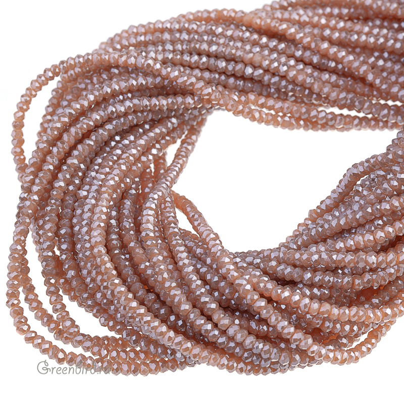 Бусины граненые Rondelle. Материал: стекло. Цвет: персиково-бежевый (практически не прозрачный, с легким дымчатым эффектом), покрытие: серебро / серебристый перламутр / светло-коричневый (смешанное, частичное, непрозрачное или полупрозрачное, нанесено на бусину в различных пропорциях). Размер: от 2,4 х 1,5 мм до 2,7 х 1,7 мм, отверстие: 0,5-0,6 мм. Цена указана за нить (примерно 120 штук).