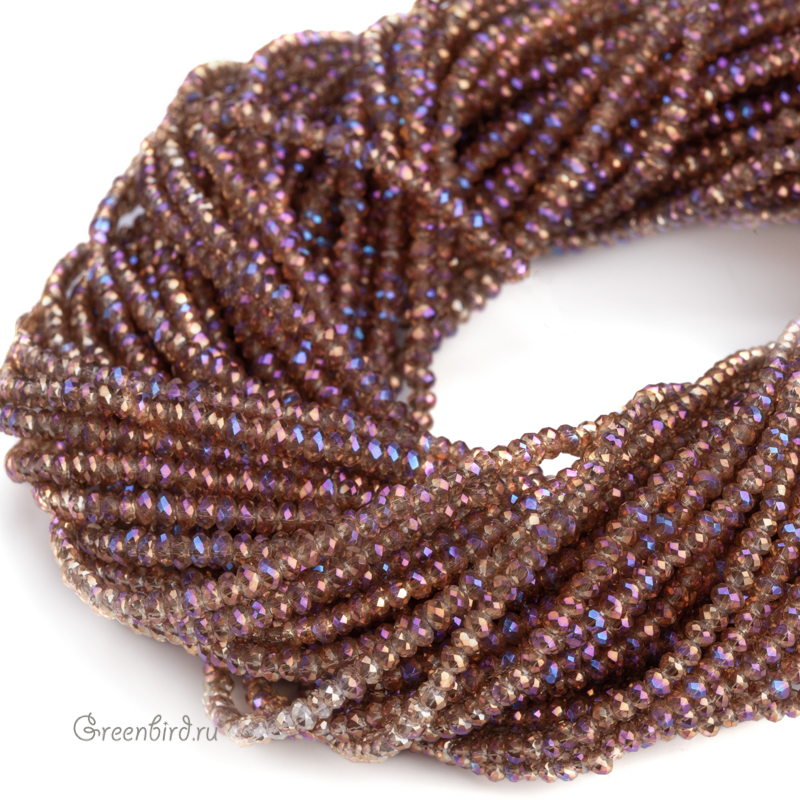 Бусины граненые Rondelle. Материал: стекло. Цвет: темно-золотистый (прозрачный) с эффектом Aurora Boreale (выраженный радужный эффект с преобладающим темно-розовым оттенком). Размер: от 2,3 х 1,5 мм до 2,8 х 1,7 мм, отверстие: 0,5-0,6 мм. Цена указана за нить (примерно 140 штук).