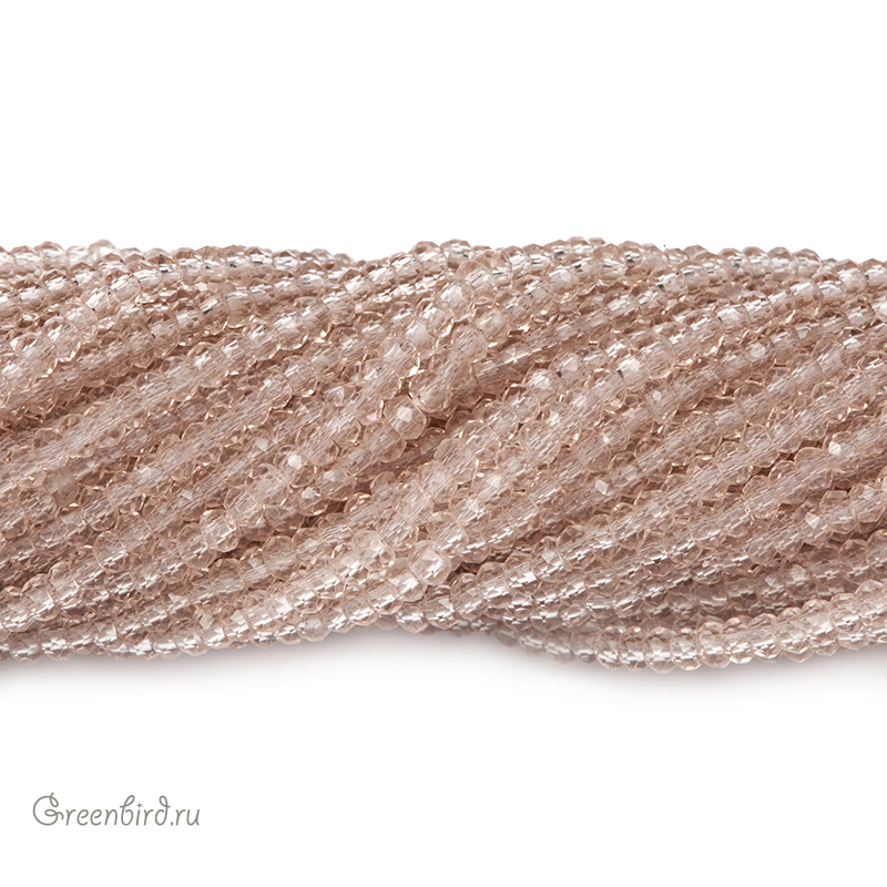 Бусины граненые Rondelle. Материал: стекло. Цвет: светло-бежевый (прозрачный) с выраженным эффектом Fire Polished (отполированные бусины), без покрытия. Размер: от 2,3 х 1,4 мм до 2,4 х 1,5 мм, отверстие: 0,5-0,6 мм. Цена указана за нить (примерно 140 штук).