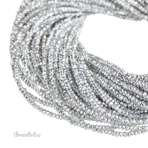 Бусины граненые Rondelle. Материал: стекло. Цвет: хрусталь (прозрачный), покрытие: светлое серебро, глянцевый металлик (полное, непрозрачное, возможен искристый эффект, а также легкие переходы в более темные тона); допускается наличие бусин с частично стертым покрытием. Размер: от 2,4 х 1,6 мм до 2,7 х 1,8 мм, отверстие: 0,5-0,6 мм. Цена указана за нить (примерно 130 штук).