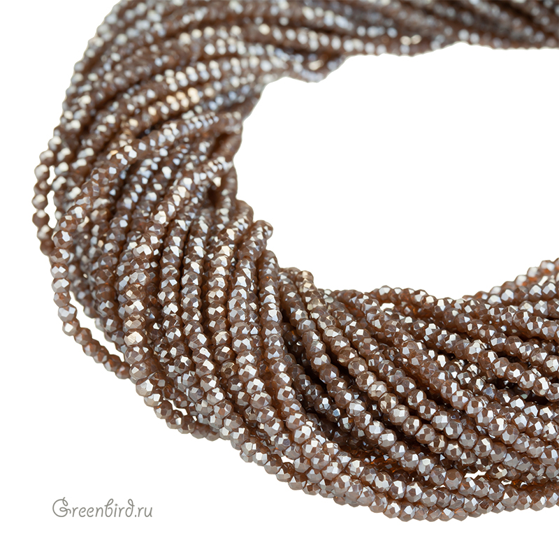 Бусины граненые Rondelle. Материал: стекло. Цвет: дымчатый топаз, коричневато-серый (дымчатый, полупрозрачный, на просвет светло-коричневый), покрытие: серебристый перламутр (полное, полупрозрачное). Допускается наличие бусин с практически прозрачным или стертым покрытием. Размер: от 2,3 х 1,6 мм до 2,5 х 1,8 мм, отверстие: 0,5-0,6 мм. Цена указана за нить (примерно 130 штук).