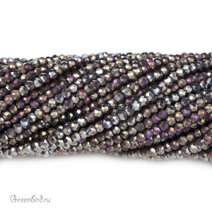Бусины граненые Rondelle. Материал: стекло. Цвет: опалово-серый (полупрозрачный), покрытие: золотистый перламутр / Aurore Boreale с фиолетовым акцентом (смешанное, полное, полупрозрачное, нанесено на бусину в различных пропорциях). Из-за особенностей покрытия бусины могут незначительно отличаться по цвету. Размер: от 2,2 х 1,7 мм до 2,3 х 1,9 мм, отверстие: 0,5-0,6 мм. Цена указана за нить (примерно 140 штук).