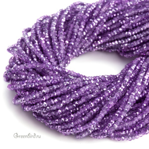 Бусины граненые Rondelle. Материал: стекло. Цвет: сиреневый (прозрачный), покрытие: сиреневый металлик / насыщенный сиреневый металлик (частичное, непрозрачное, нанесено примерно на половину бусины, на некоторых бусинах смешанное). Размер: от 2,2 х 1,4 мм до 2,3 х 1,6 мм, отверстие: 0,5-0,6 мм. Цена указана за нить (примерно 130 штук).