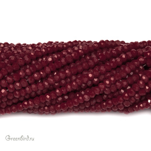 Бусины граненые Rondelle. Материал: стекло. Цвет: темно-красный (непрозрачный) с эффектом Fire Polished (отполированные бусины), без покрытия. Размер: от 2,3 х 1,7 мм до 2,6 х 1,8 мм, отверстие: 0,5-0,6 мм. Цена указана за нить (примерно 140 штук).