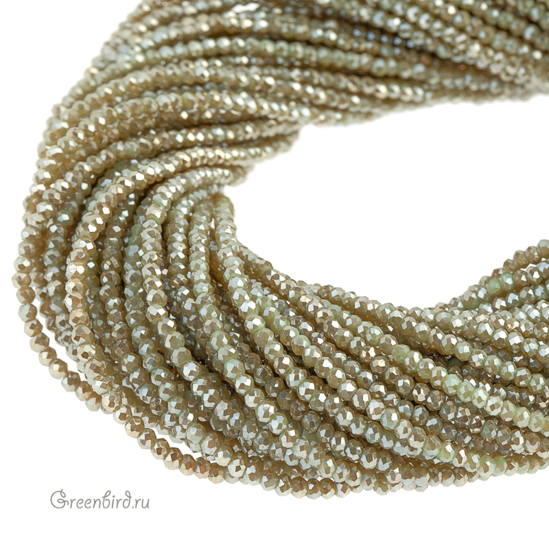 Бусины граненые Rondelle. Материал: стекло. Цвет: полынный (полупрозрачный, дымчатый), покрытие: бежевый перламутр (полное или частичное, полупрозрачное). Размер: от 2,3 х 1,7 мм до 2,5 х 1,9 мм, отверстие: 0,5-0,6 мм. Цена указана за нить (примерно 130 штук).