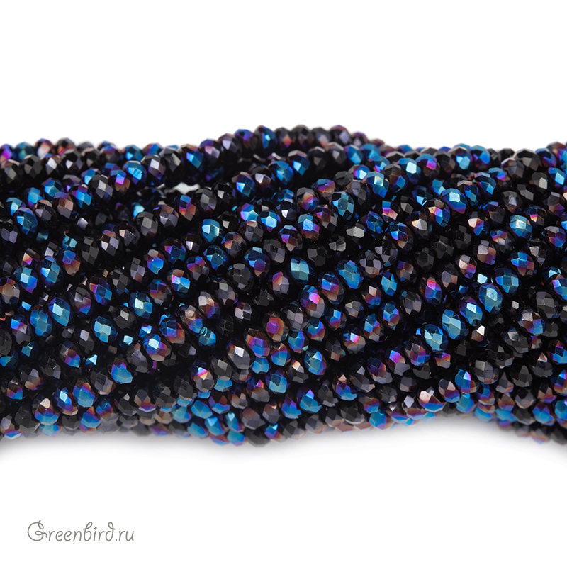 Бусины граненые Rondelle. Материал: стекло. Цвет: черный (непрозрачный) с эффектом Fire Polished (отполированные бусины), покрытие: темно-голубой металлик / темный Aurore Boreale (смешанное, частичное, нанесено на бусину в различных пропорциях). Из-за особенностей покрытия бусины в одной упаковке отличаются по цвету. Размер: от 2,4 х 1,5 мм до 2,6 х 1,7 мм, отверстие: 0,5-0,6 мм. Цена указана за нить (примерно 140 штук).