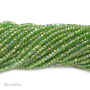 Бусины граненые Rondelle. Материал: стекло. Цвет: яркий травянисто-зеленый (прозрачный), покрытие: золотой / Aurore Boreale с легким синим акцентом (смешанное, полное, полупрозрачное или практически прозрачное, нанесено на бусину в различных пропорциях). Из-за особенностей покрытия бусины могут незначительно отличаться по цвету. Размер: от 2,2 х 1,4 мм до 2,5 х 1,7 мм, отверстие: 0,5-0,6 мм. Цена указана за нить (примерно 120 штук).