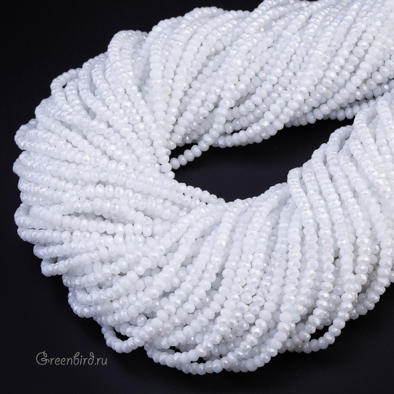 Бусины граненые Rondelle. Материал: стекло. Цвет: жемчужно-белый (непрозрачный), покрытие: серебристый перламутр (частичное, полупрозрачное или непрозрачное). Размер: от 3 х 2,1 мм до 3,3 х 2,3 мм, отверстие: 0,5-0,6 мм. Цена указана за нить (примерно 175 штук).