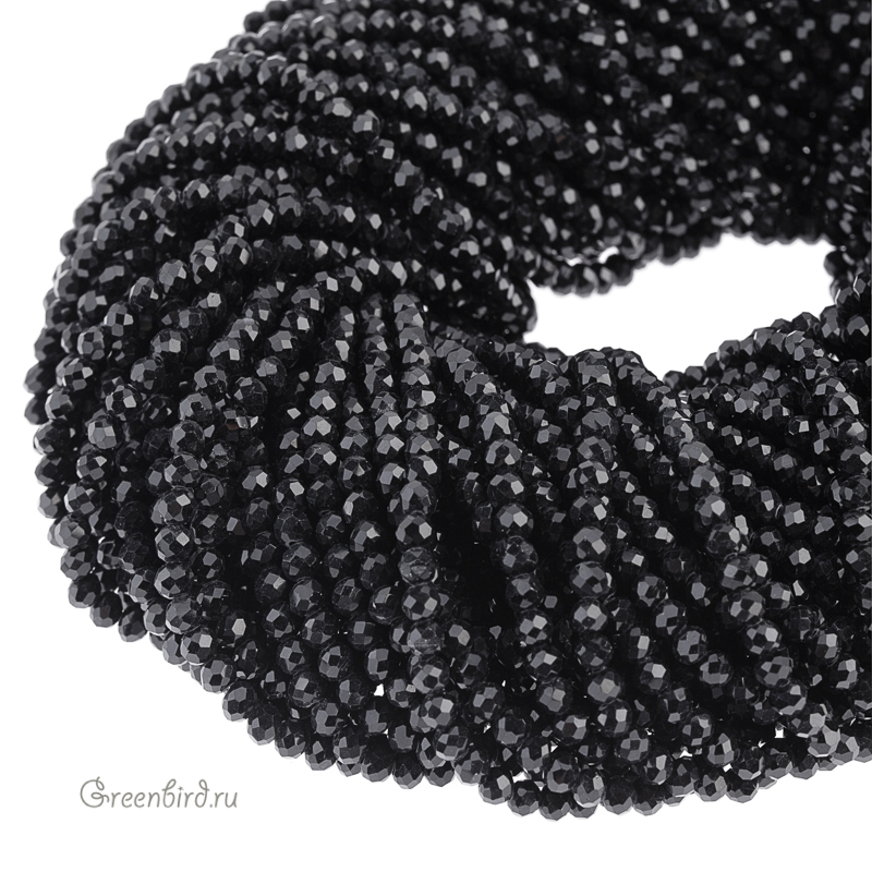Бусины граненые Rondelle. Материал: стекло. Цвет: черный (непрозрачный). Размер: от 4,0 х 3,3 мм до 4,4 х 3,7 мм, отверстие: 0,5-0,6 мм. Цена указана за нить (примерно 140 штук).