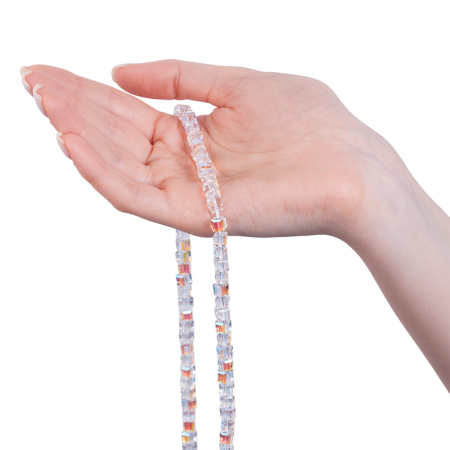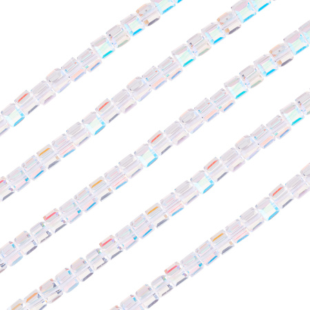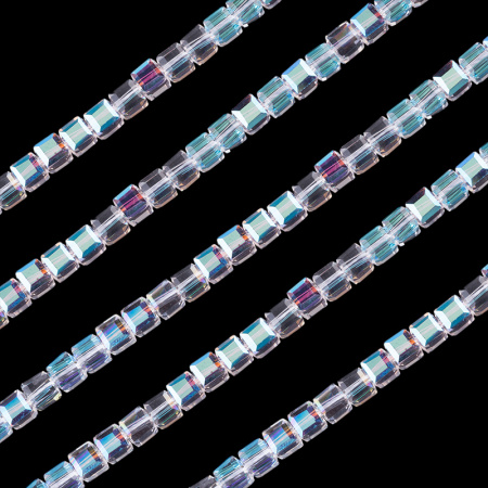 Бусины граненые в форме куба. Материал: стекло, цвет: Crystal AB (прозрачный с радужным переливом). Размер: примерно 6 х 6 мм, диаметр отверстия: 1,5 мм. Производство: Китай. Цена указана за нить 39-40 см (примерно 70 штук).