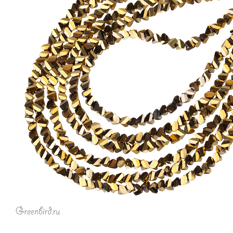 Бусины граненые абстрактной формы, похожие на крошку. Материал: стекло, цвет: темное золото (металлизированный). Размер: 3 х 4,3 мм, диаметр отверстия: 1 мм. Производство: Китай. Цена указана за нить 33-37 см (в зависимости от партии, длина нити может варьироваться).
