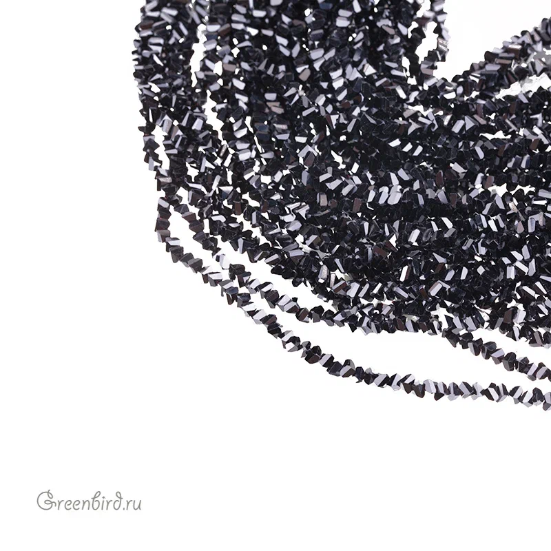 Бусины граненые абстрактной формы, похожие на крошку. Материал: стекло, цвет: черный. Размер: 2,5 х 3,5 мм, диаметр отверстия: 1 мм. Производство: Китай. Цена указана за нить 33-35 см (в зависимости от партии, длина нити может варьироваться).