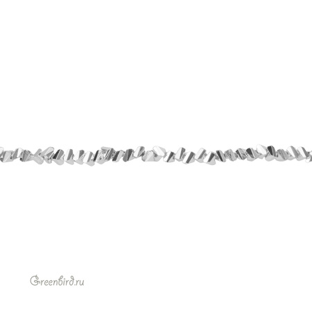 Бусины граненые абстрактной формы (треугольник), похожие на крошку. Материал: стекло с гальваническое покрытием, цвет: серебристый. Размер: примерно 3,5 х 4,5 x 4 мм, диаметр отверстия: 0,8 мм. Производство: Китай. Цена указана за нить 32-35 см (примерно 130-135 штук).