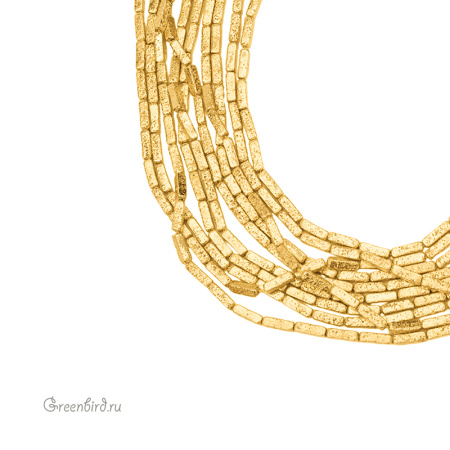Бусины из геметина с гальваническим покрытием в форме прямоугольных палочек. Бусины обладают неоднородной пористой структурой и могут незначительно различаться по размеру.