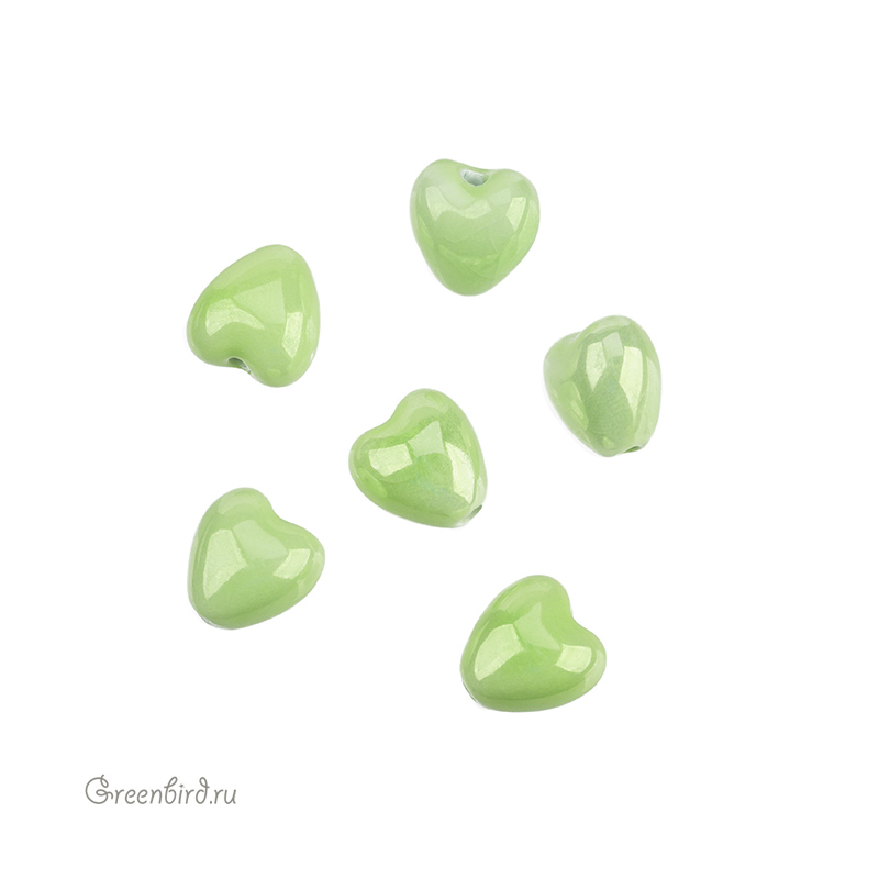 Бусина керамическая в форме сердца глянцевая с эффектом перламутра. Материал: керамика. Цвет: зеленый. Размер: 12 х 12,5 мм, толщина: 9,5 мм, диаметр отверстия: 1,8 мм. Производство: Китай. Цена указана за 1 шт.
