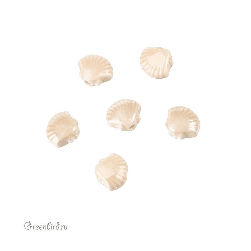 Бусина керамическая в форме ракушки глянцевая с эффектом перламутра. Материал: керамика. Цвет: бежевый. Размер: 12 х 10 мм, толщина: 6 мм, диаметр отверстия: 1,8 мм. Производство: Китай. Цена указана за 1 шт.