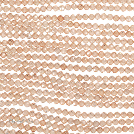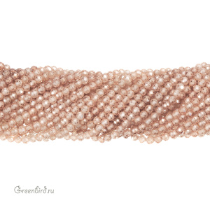Бусины Циркон (фианит или кубический цирконий) ювелирной огранки. Материал: синтетический камень. Цвет: бежевый (прозрачный). Размер: 3,2 х 3,1 мм, диаметр отверстия: 0,5 мм. Производство: Китай. Цена указана за нить 37-38 см (примерно 124 штуки).