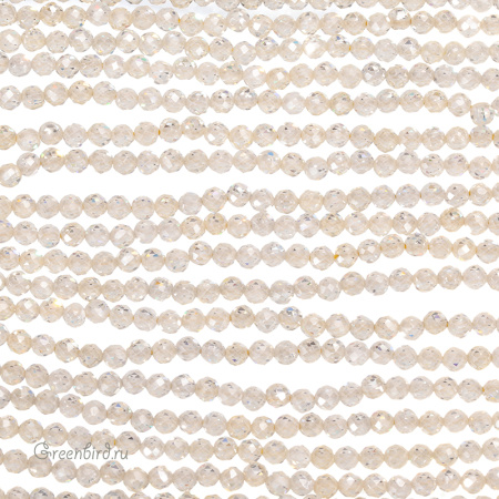 Бусины Циркон (фианит или кубический цирконий) ювелирной огранки. Материал: синтетический камень. Цвет: шампань (прозрачный). Обратите внимание: бусины собраны на цветную нить, цвет бусин без нити бледнее. Размер: 3,2 х 3,1 мм, диаметр отверстия: 0,5 мм. Производство: Китай. Цена указана за нить 37-38 см (примерно 124 штуки).