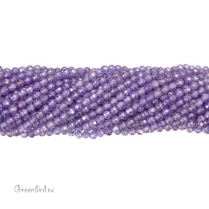 Бусины Циркон (фианит или кубический цирконий) ювелирной огранки. Материал: синтетический камень. Цвет: аметистовый (прозрачный). Размер: 3,2 х 3,1 мм, диаметр отверстия: 0,5 мм. Производство: Китай. Цена указана за нить 37-38 см (примерно 124 штуки).