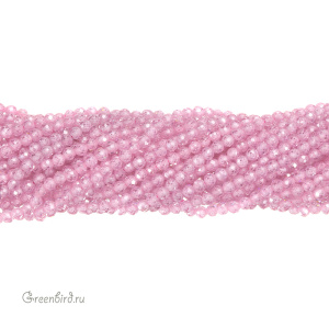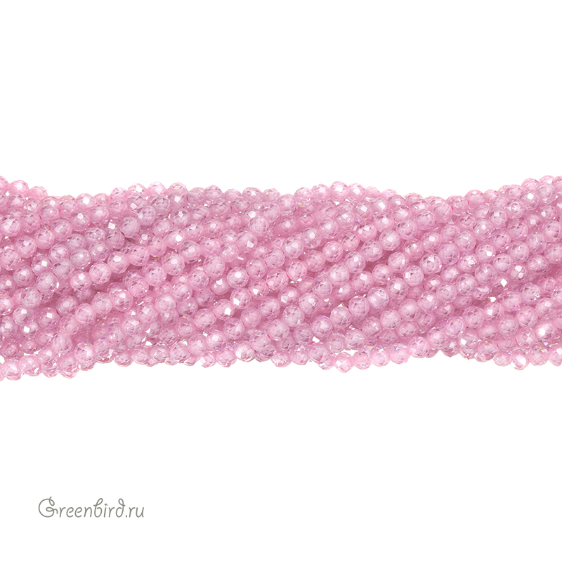 Бусины Циркон (фианит или кубический цирконий) ювелирной огранки. Материал: синтетический камень. Цвет: розовый (прозрачный). Размер: 3,2 х 3,1 мм, диаметр отверстия: 0,5 мм. Производство: Китай. Цена указана за нить 37-38 см (примерно 124 штуки).