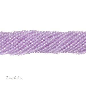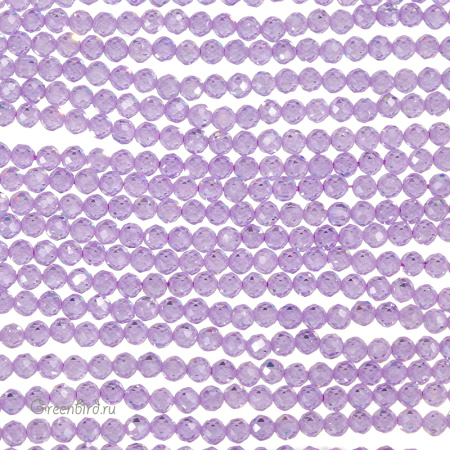 Бусины Циркон (фианит или кубический цирконий) ювелирной огранки. Материал: синтетический камень. Цвет: сиреневый (прозрачный). Размер: 3,2 х 3,1 мм, диаметр отверстия: 0,5 мм. Производство: Китай. Цена указана за нить 37-38 см (примерно 124 штуки).