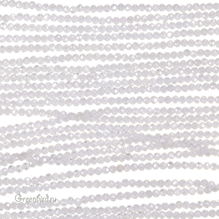 Бусины Циркон (фианит или кубический цирконий) ювелирной огранки. Материал: синтетический камень. Цвет: белый (прозрачный). Размер: 2 х 1,9 мм, диаметр отверстия: 0,5 мм. Производство: Китай. Цена указана за нить 37-38 см (примерно 204 штуки).