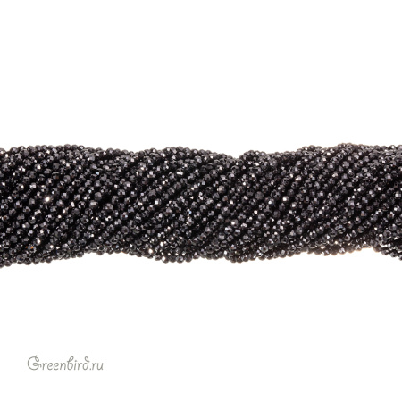 Бусины Циркон (фианит или кубический цирконий) ювелирной огранки. Материал: синтетический камень. Цвет: черный (непрозрачный). Размер: 2 х 1,9 мм, диаметр отверстия: 0,5 мм. Производство: Китай. Цена указана за нить 37-38 см (примерно 204 штуки).