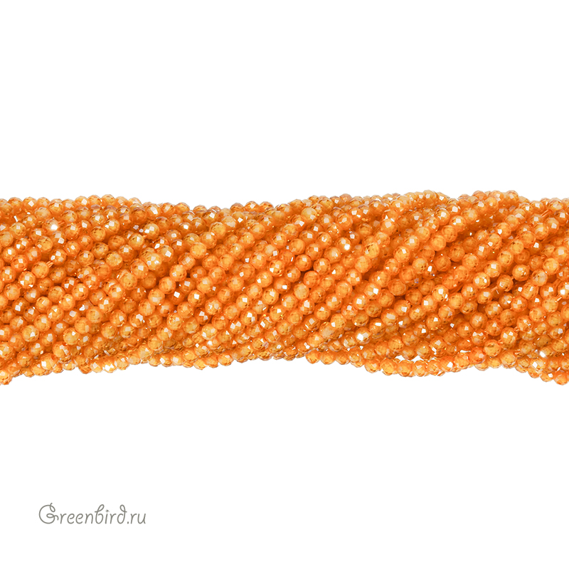 Бусины Циркон (фианит или кубический цирконий) ювелирной огранки. Материал: синтетический камень. Цвет: оранжевый (прозрачный). Размер: 2 х 1,9 мм, диаметр отверстия: 0,5 мм. Производство: Китай. Цена указана за нить 37-38 см (примерно 204 штуки).